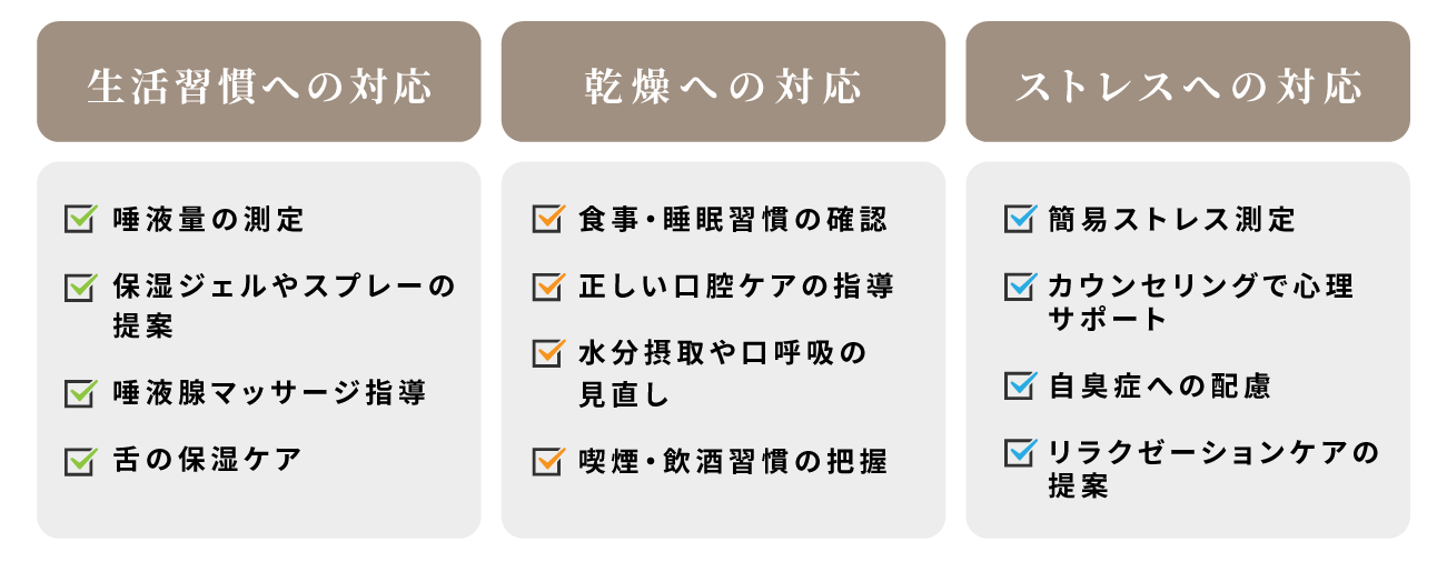 生活習慣や唾液量の減少(ドライマウス)、ストレスなど、複数の要因が重なると、口臭が悪化しやすくなります。ほんだ式口臭ケアでは、これらの要因を丁寧に分析し、総合的なアプローチを行います。