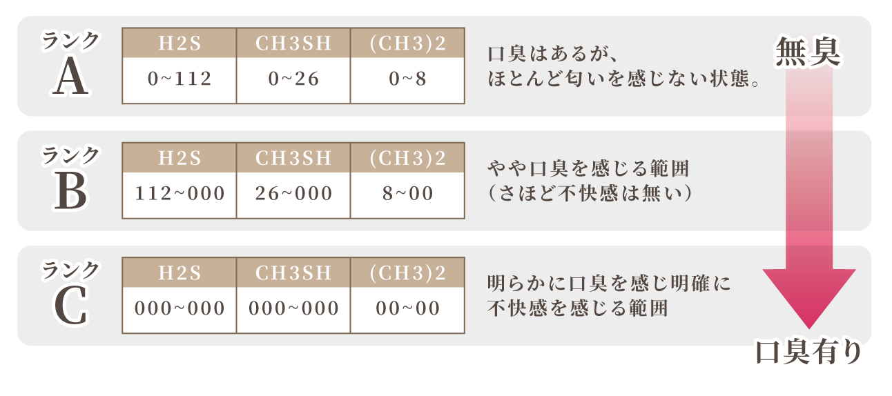 上の図は、ガスクロマトグラフ「OralChroma™」で測定された数値に基づき、口臭の強さをランク付けした一覧表です。口臭の程度をA〜Cの3段階で評価しています。